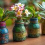 Decoration is what transforms recycled bottles into beautiful flower pots. Acrylic paints work best because they adhere well to plastic and resist water.