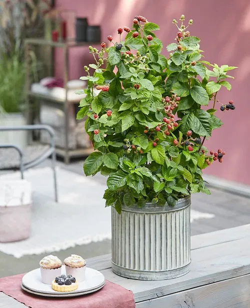 - Blackberries: ‘Black Satin,’ ‘Apache,’ and thornless varieties are easier to handle in containers.